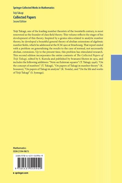 Teiji Takagi one of the leading number theorists of this century, is most renowned as the founder of class field theory. This volume reflects the stages of his development of this theory. Inspired by a genial idea related to analytic number theory, he developed a beautiful general theory of abelian extensions of algebraic number fields which he addressed at the ICM 1920 at Strasbourg. This report ends with a problem to generalize the results to the case of normal, not necessarily abelian extensions. Up to now this problem has stimulated research. This second edition incorporates the whole contents of "The Collected Papers of Teiji Takagi" edited by S. Kuroda, published by Iwanami Shoten in 1974. Following additions have been made: Note on Eulerian squares (1946).- Concept of numbers.- K. Iwasawa: On arithmetical papers of Takagi.- K. Yosida: On analytical papers of Takagi.- S. Iyanaga: On life and works of Takagi.