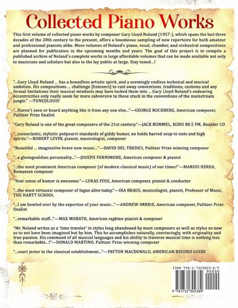 This compilation of music by Gary Lloyd Noland (1957-) represents a sampling of his compositions for piano spanning the last three decades of the 20th century until the time of this writing (2021). This is a multi-faceted collection of piano pieces ranging in level from lower intermediate to upper advanced. Included in this volume are three piano rags: Russell Street Rag Op. 5 (named after the street in Berkeley on which the composer grew up), Nerdfox Rag Op. 23, and Ragbones Op. 11 (which has been described as the first piano rag in history containing a bona fide development section), along with a deconstructed and abbreviated version thereof excerpted from the composer's multi-fascicle chamber novel Venge Art (Fascicle #5, Op. 54). Also included are two fugues: Deformed Fugue Op. 17 (which can also be played on the harpsichord) and Liebesschmerz Fuge Op. 95 (in memoriam Lukas Foss), the latter of which is an intricately complex, technically daunting contrapuntal study that took the composer upwards of 28 years to complete. Several of the works in this volume-notably the Prelude in E Minor Op. 34, the Allemande in F Major Op. 76, and both Two-Part Inventions (in D Major Op. 81 and D Minor Op. 70)-pay homage to J.S. Bach and are executable on both piano and harpsichord. The Andante in F Minor for piano four-hands Op. 46 was written in homage to Franz Schubert and is the only four-hand piece included in this collection. Several other works in this volume were composed in memory of various artists: Aeternum Vale Op. 93, in memory of author David Foster Wallace following his tragic and untimely death by suicide in September, 2008; Mortesque Op. 31, in memory of composer Stephen Albert following his death in an automobile accident in December, 1992; Funeral Waltz Op. 91, in memory of John Swackhamer, one of Noland's composition teachers at U.C. Berkeley; Obsequy Op. 41, No. 5, in memory of Ivan Tcherepnin (son of Alexander Tcherepnin), one of Noland's dissertation advisors at Harvard; not to mention the most recent work in this volume-the heretofore unpublished Adagietto Doloroso Op. 121-in memory of composer/pianist Frederic Rzewski (1938-2021), who passed away only a few short weeks prior to the time of this writing. Epicedium Op. 58 was written as a memorial to the thousands of innocent victims who died in the terrorist attacks of September 11th, 2001. Aside from these epitaphs, several other pieces included in this volume were written intentionally for young and/or beginning to intermediate level pianists: Broom Brigade Op. 25, Melancholic Moneymonger Op. 26, Three Little Bonbons Op. 59, Blues Flash Op. 42, in addition to most of the pieces that comprise the mini-sets Op. 40 and Op. 41. Suffice it to say that this initial volume of Noland's collected piano works provides a bounteous abundance of new repertoire for both amateur and professional pianists alike, as well as for students. More affordable volumes of Noland's piano, vocal, chamber, and orchestral music are planned for publication in the upcoming months and years.