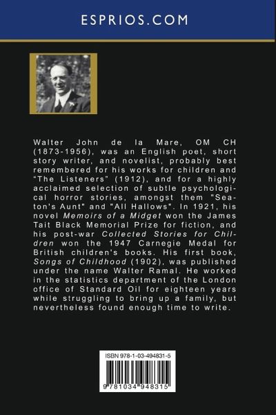 Walter John de la Mare, OM CH (1873-1956), was an English poet, short story writer, and novelist, probably best remembered for his works for children and "The Listeners" (1912), and for a highly acclaimed selection of subtle psychological horror stories, amongst them "Seaton's Aunt" and "All Hallows". In 1921, his novel Memoirs of a Midget won the James Tait Black Memorial Prize for fiction, and his post-war Collected Stories for Children won the 1947 Carnegie Medal for British children's books. His first book, Songs of Childhood (1902), was published under the name Walter Ramal. He worked in the statistics department of the London office of Standard Oil for eighteen years while struggling to bring up a family, but nevertheless found enough time to write.