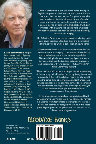 David Constantine was born in 1944 in Salford, Lancashire. He read Modern Languages at Wadham College, Oxford, and lectured in German at Durham from 1969 to 1981 and at Oxford from 1981 to 2000. He is a freelance writer and translator, a Fellow of the Queen's College, Oxford, and was co-editor of Modern Poetry in Translation from 2004 to 2013. He lives in Oxford and on Scilly. He has published ten books of poetry, five translations and a novel with Bloodaxe. His poetry titles include Something for the Ghosts (2002), which was shortlisted for the Whitbread Poetry Award; Collected Poems (2004), a Poetry Book Society Recommendation; Nine Fathom Deep (2009); and Elder (2014). His eleventh collection, Belongings, is published by Bloodaxe in 2020. His Bloodaxe translations include editions of Henri Michaux and Philippe Jaccottet; his Selected Poems of Hölderlin, winner of the European Poetry Translation Prize, and his version of Hölderlin's Sophocles, combined in his new expanded Hölderlin edition, Selected Poetry (2018); and his translation of Hans Magnus Enzensberger's Lighter Than Air, winner of the Corneliu M. Popescu Prize for European Poetry Translation. His other books include A Living Language: Newcastle/Bloodaxe Poetry Lectures (2004), his translation of Goethe's Faust in Penguin Classics (2005, 2009), his monograph Poetry (2013) in Oxford University Press's series The Literary Agenda, and his co-translation (with Tom Kuhn) of The Collected Poems of Bertolt Brecht (W.W. Norton, 2018). He has published six collections of short stories, and won the Frank O'Connor International Short Story Award in 2013 for his collection Tea at the Midland (Comma Press), and is the first English writer to win this prestigious international fiction award. Four other short story collections, Under the Dam (2005), The Shieling (2009), In Another Country: Selected Stories (2015) and The Dressing-Up Box (2019), and his second novel, The Life-Writer (2015), are published by Comma Press. His story 'Tea at the Midland' won the BBC National Short Story Award in 2010, while 'In Another Country' was adapted into 45 Years, a major film starring Tom Courtney and Charlotte Rampling.