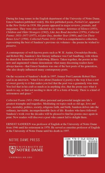 "The poems of Ernest Sandeen among other things record not only a writing life but a life in writing: a history of the hours when reflection turns to discovery, and observation finds its fulfillment in the rhythms of a sentence, the weaving of consonants through a line, in pursuit of a mystery. Few poets have been blessed with the gift to sustain that process of meditation, composing, and questioning so consistently, and for so long, in works that are clear-eyed, passionate, and precise." -Robert Pinsky, from the Foreword During his long tenure in the English department of the University of Notre Dame, Ernest Sandeen published widely. His first published poem, "Parked Car," appeared in the New Yorker in 1938. After that, his poems appeared in major reviews, journals, and magazines. They were also collected in six volumes: Antennas of Silence (1953), Children and Older Strangers (1962), Like Any Road Anywhere (1976), Collected Poems: 1953-1977 (1977), A Later Day, Another Year (1989), and Can These Bones Live? (1994). Collected Poems 1953-1994 is a comprehensive collection, representing the best of Sandeen's previous six volumes-the poems he wished to preserve. Ernest Sandeen spent virtually his entire life in the century's poetically generated culture. A contemporary of well-known poets such as W. H. Auden, Gwendolyn Brooks, and Robert Bly, Sandeen's first literary influence was Carl Sandburg, with whom he shared the hometown of Galesburg, Illinois. Taken together, the poems in this new and augmented volume demonstrate what many discerning readers have always known-that Ernest Sandeen was one of the best poets of his generation, who also deeply influenced many contemporary poets. On the occasion of Sandeen's death in 1997, former Poet Laureate Robert Hass said in an interview, "what I love about [Sandeen's] poetry is the way it has a sort of sweet gravity to it that makes you feel that the poet was a genuinely wise man. You feel that in his craft as much as in anything else, that the poem says what it needs to say, so that not needing to show off is a form of beauty. There is a kind of seriousness and grace."