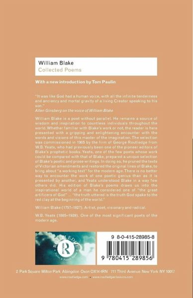This selection of Blake's work was commissioned in 1905 by the firm of George Routledge from W.B. Yeats. Yeats, one of the few poets comparable to Blake, prepared a unique selection of his poetic and prose writings.