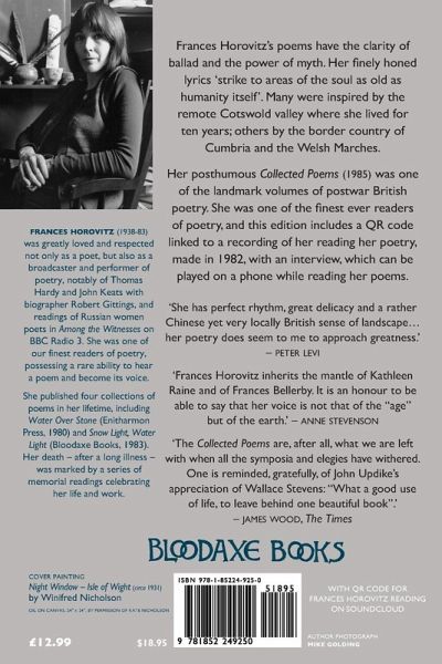 Frances Horovitz (1938-85) was greatly loved and respected not only as a poet, but also as a broadcaster and performer of poetry, notably of Thomas Hardy and John Keats with biographer Robert Gittings, and readings of Russian women poets in Among the Witnesses on BBC Radio 3. She was one of our finest readers of poetry, possessing a rare ability to hear a poem and become its voice. She published four collections of poems, including Water Over Stone (Enitharmon Press, 1980) and Snow Light, Water Light (Bloodaxe Books, 1983). She died in 1983, aged 45, after a long illness. Her Collected Poems (1985) was edited by her husband, the poet and critic Roger Garfitt, with a new edition issued in 2011 with an audio CD of her reading her work included. Those readings are now available on SoundCloud via a QR code added with a track list to the current printing of the book (which no longer includes a CD).