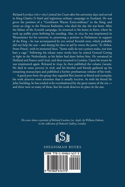 Richard Lovelace (1617-1657) joined the Court after his university days and served in King Charles I's brief and inglorious military campaign in Scotland. He was given the position of a "Gentlemen Wayter Extra-ordinary" to the King, and wrote an elegy to the Princess Katherine, who died the day she was born. After the failure of the Scottish campaign, he returned to his home in Kent, where he took up public posts befitting his standing. Alas, in 1642 he was imprisoned in Westminster for his temerity in presenting a petition to Parliament in support of the King - he was accompanied by 500 armed…mehr