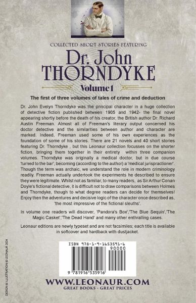 The first of three volumes of tales of crime and deduction Dr. John Evelyn Thorndyke was the principal character in a huge collection of detective fiction published between 1905 and 1942- the final novel appearing shortly before the death of his creator, the British author Dr. Richard Austin Freeman. Almost all of Freeman's literary output concerned his doctor detective and the similarities between author and character are marked. Indeed, Freeman used some of his own experiences as the foundation of some of his stories. There are 21 novels and 40 short stories featuring Dr. Thorndyke , but this Leonaur collection focusses on the shorter fiction, bringing them together in their entirety within three companion volumes. Thorndyke was originally a medical doctor, but in due course 'turned to the bar', becoming (according to the author) a 'medical jurispractioner'. Though the term was archaic, we understand the role in modern criminology readily. Freeman actually undertook the experiments he described to ensure they were legitimate. Whilst not as familiar, to many readers, as Sir Arthur Conan Doyle's fictional detective, it is difficult not to draw comparisions between Holmes and Thorndyke, though to what degree readers can decide for themselves! Enjoy then the adventures and decisive logic of the character once described as,' the most impressive of the fictional sleuths'. In volume one readers will discover, 'Pandora's Box','The Blue Sequin','The Magic Casket','The Dead Hand' and many other enthralling cases. Leonaur editions are newly typeset and are not facsimiles; each title is available in softcover and hardback with dustjacket.