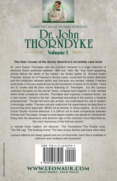 The final volume of the doctor detective's incredible case book Dr. John Evelyn Thorndyke was the principal character in a huge collection of detective fiction published between 1905 and 1942- the final novel appearing shortly before the death of his creator, the British author Dr. Richard Austin Freeman. Almost all of Freeman's literary output concerned his doctor detective and the similarities between author and character are marked. Indeed, Freeman used some of his own experiences as the foundation of some of his stories. There are 21 novels and 40 short stories featuring Dr. Thorndyke , but this Leonaur collection focusses on the shorter fiction, bringing them together in their entirety within three companion volumes. Thorndyke was originally a medical doctor, but in due course 'turned to the bar', becoming (according to the author) a 'medical jurispractioner'. Though the term was archaic, we understand the role in modern criminology readily. Freeman actually undertook the experiments he described to ensure they were legitimate. Whilst not as familiar, to many readers, as Sir Arthur Conan Doyle's fictional detective, it is difficult not to draw comparisions between Holmes and Thorndyke, though to what degree readers can decide for themselves! Enjoy then the adventures and decisive logic of the character once described as,' the most impressive of the fictional sleuths'. In volume three readers will discover, 'The Touchstone','The Puzzle Lock','The Old Lag', 'The Stalking Horse','The New Jersey Sphinx' and many other tales. Leonaur editions are newly typeset and are not facsimiles; each title is available in softcover and hardback with dustjacket.