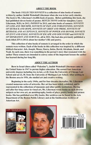 The book COLLECTED SONNETS is a collection of nine books of sonnets written by author Judith Weinshall Liberman when she was in her early nineties. The book is Ms. Liberman's twelfth book of poems. Before publishing this book, she had published eleven books of poems: REFLECTIONS (with her daughter, Laura Liberman, M.D.) in 2012, PASSION in 2013, and nine books of sonnets: SONNETS OF LOSS AND TRIUMPH, SONNETS OF PAIN AND FORGIVENESS, SONNETS OF SETBACK AND HOPE, SONNETS OF GRIEF AND PRIDE, SONNETS OF BETRAYAL AND ACCEPTANCE, SONNETS OF POWER AND HONOR, SONNETS OF ENVY AND EXILE, SONNETS OF ESCAPE AND DISCOVERY and SONNETS OF SEPARATION AND SURVIVAL, all in 2021. She had also previously published a book titled ZINA (2013) about her mother's life and poetry. This collection of nine books of sonnets is arranged in the order in which they were written. Each of the books in this collection was inspired by a different biblical character: Job, Joseph, Moses, Sisera, Judas, David, Abraham, Jonah, and Noah. In each case, there was something in the character's story that resonated with the author These sonnets are intended to convey some of the important lessons the author has learned during her long life.