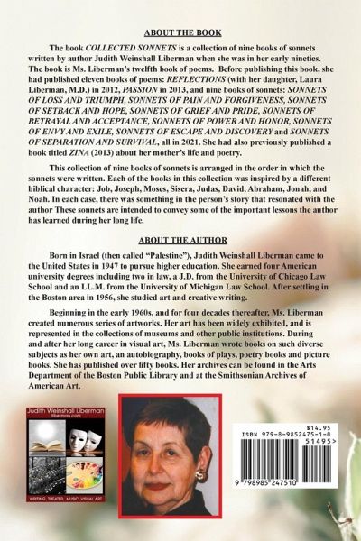 The book COLLECTED SONNETS is a collection of nine books of sonnets written by author Judith Weinshall Liberman when she was in her early nineties. The book is Ms. Liberman's twelfth book of poems. Before publishing this book, she had published eleven books of poems: REFLECTIONS (with her daughter, Laura Liberman, M.D.) in 2012, PASSION in 2013, and nine books of sonnets: SONNETS OF LOSS AND TRIUMPH, SONNETS OF PAIN AND FORGIVENESS, SONNETS OF SETBACK AND HOPE, SONNETS OF GRIEF AND PRIDE, SONNETS OF BETRAYAL AND ACCEPTANCE, SONNETS OF POWER AND HONOR, SONNETS OF ENVY AND EXILE, SONNETS OF ESCAPE AND DISCOVERY and SONNETS OF SEPARATION AND SURVIVAL, all in 2021. She had also previously published a book titled ZINA (2013) about her mother's life and poetry. This collection of nine books of sonnets is arranged in the order in which they were written. Each of the books in this collection was inspired by a different biblical character: Job, Joseph, Moses, Sisera, Judas, David, Abraham, Jonah, and Noah. In each case, there was something in the character's story that resonated with the author These sonnets are intended to convey some of the important lessons the author has learned during her long life.