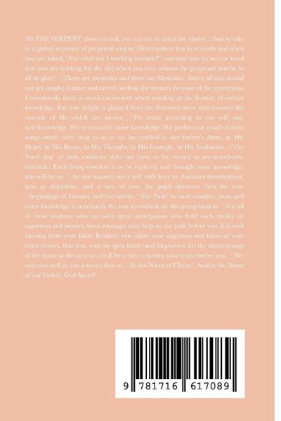 AS THE SERPENT chases its tail, one can try to catch the elusive Sun to take in a global sequence of perpetual sunrise. Development has its rewards and when you are asked, "For what am I working towards?" you may take us on our word that you are working for the day when you may witness the perpetual sunrise in all its glory! There are mysteries and there are Mysteries. Above all one should not get caught, feather and tarred, seeking the mystery because of the mysterious. Undoubtedly there is much excitement when standing at the frontier of certain knowledge. But true delight is gleaned from the discovery anew that reasserts the marvels of life which are known. We learn according to our will and soul-knowledge. We re-exact the inner knowledge. We perfect our recall of those songs which were sung to us as we lay cradled in our Father's Arms, in His Heart, in His Breast, in His Thought, in His Example, in His Exaltation. The 'hard slog' of daily existence does not have to be viewed as an unwelcome interlude. Each living moment is to be rejoiced; and through inner knowledge, this will be so. As one masters one's self, with keys to character development, keys to objectivity, and a love of love; the pupil discovers then the true beginnings of Eternity and her talents. "The Path" to such wonder- ment and inner knowledge is necessarily the way to embark on this peregrination. For all of those students who are with great anticipation who hold such vitality of eagerness and inquiry, these messages may help set the path before you. It is with blessing from your Elder Brothers who share your eagerness and know of your inner desires, that you, with an open heart (and forgiveness for the shortcomings of the typist so dictated to), shall for a time consider what is put before you. We wish you well as you journey thus so, In the Name of Christ, And in the Name of our Father, God Speed!