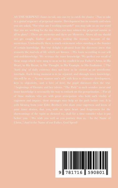 AS THE SERPENT chases its tail, one can try to catch the elusive Sun to take in a global sequence of perpetual sunrise. Development has its rewards and when you are asked, "For what am I working towards?" you may take us on our word that you are working for the day when you may witness the perpetual sunrise in all its glory! There are mysteries and there are Mysteries. Above all one should not get caught, feather and tarred, seeking the mystery because of the mysterious. Undoubtedly there is much excitement when standing at the frontier of certain knowledge. But true delight is gleaned from the discovery anew that reasserts the marvels of life which are known. We learn according to our will and soul-knowledge. We re-exact the inner knowledge. We perfect our recall of those songs which were sung to us as we lay cradled in our Father's Arms, in His Heart, in His Breast, in His Thought, in His Example, in His Exaltation. The 'hard slog' of daily existence does not have to be viewed as an unwelcome interlude. Each living moment is to be rejoiced; and through inner knowledge, this will be so. As one masters one's self, with keys to character development, keys to objectivity, and a love of love; the pupil discovers then the true beginnings of Eternity and her talents. "The Path" to such wonder- ment and inner knowledge is necessarily the way to embark on this peregrination. For all of those students who are with great anticipation who hold such vitality of eagerness and inquiry, these messages may help set the path before you. It is with blessing from your Elder Brothers who share your eagerness and know of your inner desires, that you, with an open heart (and forgiveness for the shortcomings of the typist so dictated to), shall for a time consider what is put before you. We wish you well as you journey thus so, In the Name of Christ, And in the Name of our Father, God Speed!