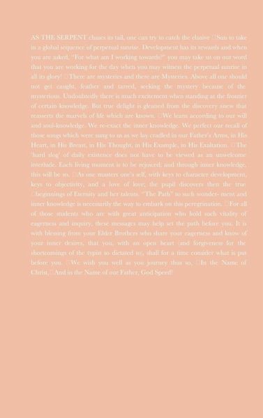AS THE SERPENT chases its tail, one can try to catch the elusive Sun to take in a global sequence of perpetual sunrise. Development has its rewards and when you are asked, "For what am I working towards?" you may take us on our word that you are working for the day when you may witness the perpetual sunrise in all its glory! There are mysteries and there are Mysteries. Above all one should not get caught, feather and tarred, seeking the mystery because of the mysterious. Undoubtedly there is much excitement when standing at the frontier of certain knowledge. But true delight is gleaned from the discovery anew that reasserts the marvels of life which are known. We learn according to our will and soul-knowledge. We re-exact the inner knowledge. We perfect our recall of those songs which were sung to us as we lay cradled in our Father's Arms, in His Heart, in His Breast, in His Thought, in His Example, in His Exaltation. The 'hard slog' of daily existence does not have to be viewed as an unwelcome interlude. Each living moment is to be rejoiced; and through inner knowledge, this will be so. As one masters one's self, with keys to character development, keys to objectivity, and a love of love; the pupil discovers then the true beginnings of Eternity and her talents. "The Path" to such wonder- ment and inner knowledge is necessarily the way to embark on this peregrination. For all of those students who are with great anticipation who hold such vitality of eagerness and inquiry, these messages may help set the path before you. It is with blessing from your Elder Brothers who share your eagerness and know of your inner desires, that you, with an open heart (and forgiveness for the shortcomings of the typist so dictated to), shall for a time consider what is put before you. We wish you well as you journey thus so, In the Name of Christ, And in the Name of our Father, God Speed!