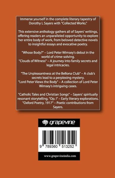 Immerse yourself in the complete literary tapestry of Dorothy L Sayers with "Collected Works." This extensive anthology gathers all of Sayers' writings, offering readers an unparalleled opportunity to explore her entire body of work, from beloved detective novels to insightful essays and evocative poetry. "Whose Body?" - Lord Peter Wimsey's debut in the world of crime-solving. "Clouds of Witness" - A journey into family secrets and legal intricacies. "The Unpleasantness at the Bellona Club" - A club's secrets lead to a perplexing mystery. "Lord Peter Views the Body" - A collection of Lord Peter Wimsey's intriguing cases. "Catholic Tales and Christian Songs" - Sayers' spiritually resonant storytelling. "Op. I" - Early literary explorations. "Oxford Poetry, 1917" - Poetic contributions from Sayers.