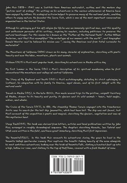 John Muir (1838- 1914) was a Scottish-born American naturalist, author, and the modern day ""patron saint of ecology"". His writings on his adventures in the various wildernesses of America have been enjoyed by millions. His ecological activism helped to preserve many of the national parks, enabling others to enjoy nature. He founded the Sierra Club, which is one of the most important conservation organizations in the United States. Although his upbringing put him off religion for life he was an immensely spiritual man, and this quality and enthusiasm pervades all his writings, inspiring his readers, including politicians to preserve the natural landscapes. For this reason he is known as the ""Father of the National Parks"". Author William Anderson, said that Muir exemplified ""the archetype of our oneness with the earth"", and biographer Donald Worster said he believed his mission was ""...saving the American soul from total surrender to materialism."" The Mountains of California (1894) draws on his many, decades of exploration, describing with poetic beauty and awe the lakes, mountains, plants and animals. Stickeen (1909) is Muir's most popular book, describing his adventures in Alaska with a dog. My First Summer in the Sierra (1911) is Muir's description of his spiritual awakening when he first encountered the mountains and valleys of central California. The Story of My Boyhood and Youth (1913) is Muir's autobiography, detailing his strict upbringing in Scotland, his emigration with his family to America, aged eleven, and of his first delight with the natural world. Travels in Alaska (1915), In the late 1800s, Muir made several trips to the pristine, unspoilt territory of Alaska, drawn to its beauty and purity, its glaciers and its wild animals - bears, bald eagles, wolves, and whales. The Cruise of the Corwin (1917), In 1881, the steamship Thomas Corwin voyaged into the treacherous Arctic seas to search for the lost ship Jeannette, which had been lost. The ship was not found, but Muir's account of this expedition is poetic and magical, describing the glaciers, vegetation and seas of this mysterious land. Steep Trails(1919), This book was derived from letters, articles and local publications written by John Muir, arranged in roughly chronological sequence. The chapters describing Nevada, San Gabriel and Utah were written in the field, and have great immediacy, describing Muir's first impressions. The Yosemite(1920), In this book Muir recounts his adventures during the years he lived in the Yosemite Valley's spectacular scenery. Muir captures the breath-taking beauty of the area alongside his most ambitious adventures; looking over the brink of Yosemite Falls, climbing a hundred feet up into a high, hollow ice-cone, and climbing to the top of Half Dome, covered with a fresh blanket of snow.