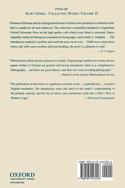 Kurt Gödel (1906 - 1978) was the most outstanding logician of the twentieth century, famous for his hallmark works on the completeness of logic, the incompleteness of number theory, and the consistency of the axiom of choice and the continuum hypothesis. He is also noted for his work on constructivity, the decision problem, and the foundations of computability theory, as well as for the strong individuality of his writings on the philosophy of mathematics. He is less well known for his discovery of unusual cosmological models for Einstein's equations, in theory permitting time travel into the past. The Collected Works is a landmark resource that draws together a lifetime of creative thought and accomplishment. The first two volumes were devoted to Gödel's publications in full (both in original and translation), and the third volume featured a wide selection of unpublished articles and lecture texts found in Gödel's Nachlass. These long-awaited final two volumes contain Gödel's correspondence of logical, philosophical, and scientific interest. Volume IV covers A to G, with H to Z in volume V; in addition, Volume V contains a full inventory of Gödel's Nachlass. All volumes include introductory notes that provide extensive explanatory and historical commentary on each body of work, English translations of material originally written in German (some transcribed from the Gabelsberger shorthand), and a complete bibliography of all works cited. Kurt Gödel: Collected Works is designed to be useful and accessible to as wide an audience as possible without sacrificing scientific or historical accuracy. The only comprehensive edition of Gödel's work available, it will be an essential part of the working library of professionals and students in logic, mathematics, philosophy, history of science, and computer science and all others who wish to be acquainted with one of the great minds of the twentieth century.