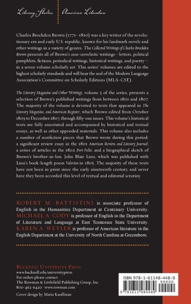 Charles Brockden Brown (1771-1810) was a key writer of the revolutionary era and early U.S. republic, known for his landmark novels and other writings in a variety of genres. The Collected Writings of Charles Brockden Brown presents all of Brown's non-novelistic writings-letters, political pamphlets, fictions, periodical writings, historical writings, and poety-in a seven-volume scholarly set. This series' volumes are edited to the highest scholarly standards and will bear the seal of the Modern Language Association Committee on Scholarly Editions (MLA-CSE). The Literary Magazine and Other Writings, volume 3 of the series, presents a selection of Brown's published writings between 1801 and 1807. The majority of the volume is devoted to texts that appeared in The Literary Magazine, and American Register, which Brown edited from October 1803 to December 1807, through fifty-one issues. The volume also includes a number of additional non-fiction pieces that Brown wrote during this period: a significant review essay in the 1801 American Review, and Literary Journal; a series of articles in the 1802 Port Folio; and a biographical sketch of Brown's late brother-in-law, John Blair Linn, which was published with Linn's book-length poem Valerian in 1805. The majority of these texts have not been in print since the early nineteenth century, and never have they been accorded this level of textual and editorial scrutiny.