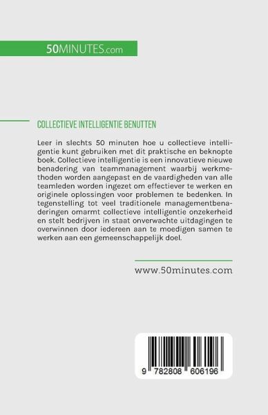 Leer in slechts 50 minuten hoe u collectieve intelligentie kunt gebruiken met dit praktische en beknopte boek. Collectieve intelligentie is een innovatieve nieuwe benadering van teammanagement waarbij werkmethoden worden aangepast en de vaardigheden van alle teamleden worden ingezet om effectiever te werken en originele oplossingen voor problemen te bedenken. In tegenstelling tot veel traditionele managementbenaderingen omarmt collectieve intelligentie onzekerheid en stelt bedrijven in staat onverwachte uitdagingen te overwinnen door iedereen aan te moedigen samen te werken aan een gemeenschappelijk doel. In dit boek leert u hoe collectieve intelligentie u kan helpen nieuwe kennis te ontsluiten en uw team flexibeler, reactiever en innovatiever te maken. Het bevat ook een overzicht van de belangrijkste principes van deze benadering van management, tips om de vaardigheden van uw team optimaal te benutten en een beknopte inleiding tot verwante concepten, zoals participatief management, zodat u in een mum van tijd een effectiever en intelligenter bedrijf kunt creëren!