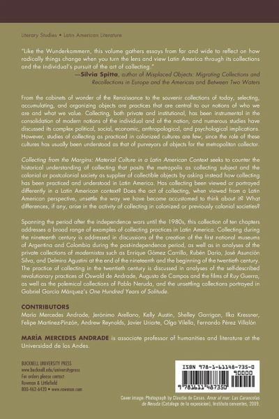 From the cabinets of wonder of the Renaissance to the souvenir collections of today, selecting, accumulating, and organizing objects are practices that are central to our notions of who we are and what we value. Collecting, both private and institutional, has been instrumental in the consolidation of modern notions of the individual and of the nation, and numerous studies have discussed its complex political, social, economic, anthropological, and psychological implications. However, studies of collecting as practiced in colonized cultures are few, since the role of these cultures has usually been understood as that of purveyors of objects for the metropolitan collector. Collecting from the Margins: Material Culture in a Latin American Context seeks to counter the historical understanding of collecting that posits the metropolis as collecting subject and the colonial or postcolonial society as supplier of collectible objects by asking instead how collecting has been practiced and understood in Latin America. Has collecting been viewed or portrayed differently in a Latin American context? Does the act of collecting, when viewed from a Latin American perspective, unsettle the way we have become accustomed to think about it? What differences, if any, arise in the activity of collecting in colonized or previously colonial societies? Spanning the period after the independence wars until the 1980s, this collection of ten essays addresses a broad range of examples of collecting practices in Latin America. Collecting during the nineteenth century is addressed in discussions of the creation of the first national museums of Argentina and Colombia in the post-independence period, as well as in analyses of the private collections of modernistas such as Enrique Gómez Carrillo, Rubén Darío, José Asunción Silva, and Delmira Agustini at the end of the nineteenth century and the beginning of the twentieth. The practice of collecting in the twentieth century is discussed in analyses of the self-described revolutionary practices of Oswald de Andrade, Augusto de Campos and the films of Ruy Guerra, as well as the polemical collections of Pablo Neruda, and the unsettling collections portrayed in Gabriel García Márquez's One Hundred Years of Solitude.
