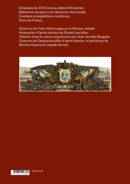 Estampes des XVIIIème et début XIX siècles: Bâtiments de guerre et bâtiments marchands. Combats et expéditions maritimes. Ports de France. Gravures de Yves-Marie Legouaz et Nicolas-Joseph Masquelier d'après dessins de Daniel Lescallier. Dessins d'après nature et gravures par Jean-Jérome Baugean. Gravures de Dequevauvillier d'après dessins de Nicolas Ozanne et Joseph Vernet.