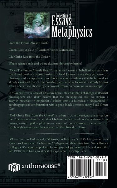 Does the Future Already Exist? Green Eyes: A Case of Dualism Verses Materialism Did Christ Rise from the Grave? Where science ends and where dualism philosophy begins! "Does The Future Already Exist?" is an essay I wrote in behalf of my very dear friend and brother in spirit, Professor David Johnson, a traveling professor of philosophy of metaphysics from Princeton who has a theory that the future does already exist and that of the possible paths we may follow it is already known which one we will choose by clairvoyant dream precognition as an example. In "Green Eyes: A Case of Dualism Verses Materialism," I challenge materialist philosophers who don’t believe that the metaphysical exist to explain a away in materialist / empiricist / atheist terms, a historical / biographical / autobiographical confrontation with a pitch black demonic entity I call Green Eyes. "Did Christ Rise from the Grave?" is where I do a investigative analyses on the Crucifixion where I state that I believe he did based on the evidence from history, eastern philosophy’s seven levels of consciousness, the science of psycho-cybernetics, and the evidence of the Shroud of Turin.