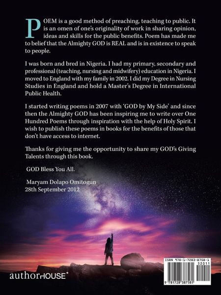 POEM is a good method of preaching, teaching to public. It is an omen of one's originality of work in sharing opinion, ideas and skills for the public benefits. Poem has made me to belief that the Almighty GOD is REAL and is in existence to speak to people. I was born and bred in Nigeria. I had my primary, secondary and professional (teaching, nursing and midwifery) education in Nigeria. I moved to England with my family in 2002. I did my Degree in Nursing Studies in England and hold a Master's Degree in International Public Health. I started writing poems in 2007 with 'GOD by My Side' and since then the Almighty GOD has been inspiring me to write over One Hundred Poems through inspiration with the help of Holy Spirit. I wish to publish these poems in books for the benefits of those that don't have access to internet. Thanks for giving me the opportunity to share my GOD's Giving Talents through this book. GOD Bless You All. Maryam Dolapo Omitogun 28th September 2012