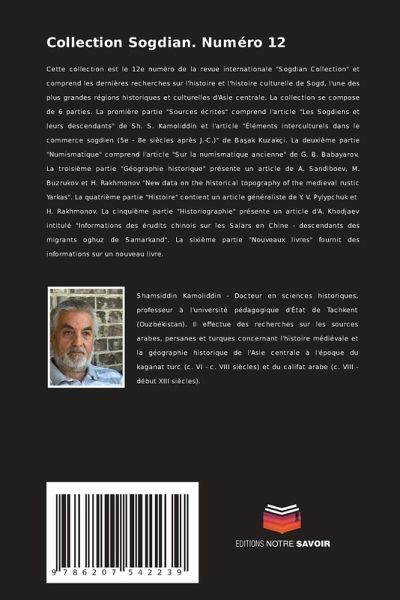 Cette collection est le 12e numéro de la revue internationale "Sogdian Collection" et comprend les dernières recherches sur l'histoire et l'histoire culturelle de Sogd, l'une des plus grandes régions historiques et culturelles d'Asie centrale. La collection se compose de 6 parties. La première partie "Sources écrites" comprend l'article "Les Sogdiens et leurs descendants" de Sh. S. Kamoliddin et l'article "Éléments interculturels dans le commerce sogdien (5e - 8e siècles après J.-C.)" de Basak Kuzakçi. La deuxième partie "Numismatique" comprend l'article "Sur la numismatique ancienne" de G. B. Babayarov. La troisième partie "Géographie historique" présente un article de A. Sandiboev, M. Buzrukov et H. Rakhmonov "New data on the historical topography of the medieval rustic Yarkas". La quatrième partie "Histoire" contient un article généraliste de Y. V. Pylypchuk et H. Rakhmonov. La cinquième partie "Historiographie" présente un article d'A. Khodjaev intitulé "Informations des érudits chinois sur les Salars en Chine - descendants des migrants oghuz de Samarkand". La sixième partie "Nouveaux livres" fournit des informations sur un nouveau livre.