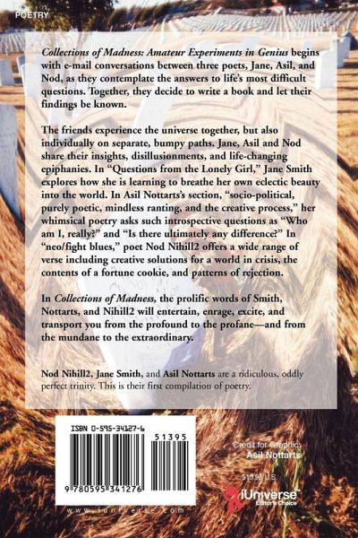 Collections of Madness: Amateur Experiments in Genius begins with e-mail conversations between three poets, Jane, Asil, and Nod, as they contemplate the answers to life's most difficult questions. Together, they decide to write a book and let their findings be known. The friends experience the universe together, but also individually on separate, bumpy paths. Jane, Asil and Nod share their insights, disillusionments, and life-changing epiphanies. In "Questions from the Lonely Girl," Jane Smith explores how she is learning to breathe her own eclectic beauty into the world. In Asil Nottarts's section, "socio-political, purely poetic, mindless ranting, and the creative process," her whimsical poetry asks such introspective questions as "Who am I, really?" and "Is there ultimately any difference?" In "neo/fight blues," poet Nod Nihill2 offers a wide range of verse including creative solutions for a world in crisis, the contents of a fortune cookie, and patterns of rejection. In Collections of Madness, the prolific words of Smith, Nottarts, and Nihill2 will entertain, enrage, excite, and transport you from the profound to the profane--and from the mundane to the extraordinary.
