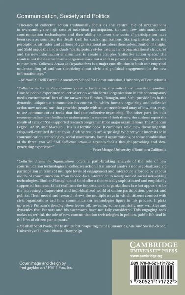 Challenging the notion that digital media render traditional, formal organizations irrelevant, this book offers a new theory of collective action and organizing. Based on extensive surveys and interviews with members of three influential and distinctive organizations in the United States - The American Legion, AARP and MoveOn - the authors reconceptualize collective action as a phenomenon in which technology enhances people's ability to cross boundaries in order to interact with one another and engage with organizations. By developing a theory of Collective Action Space, Bimber, Flanagin and Stohl explore how people's attitudes, behaviors, motivations, goals and digital media use are related to their organizational involvement. They find that using technology does not necessarily make people more likely to act collectively, but contributes to a diversity of 'participatory styles', which hinge on people's interaction with one another and the extent to which they shape organizational agendas. In the digital media age, organizations do not simply recruit people into roles, they provide contexts in which people are able to construct their own collective experiences.