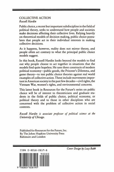 Public choice, an important subdiscipline in the field of political theory, seeks to understand how people and societies make decisions affecting their collective lives. Relying heavily on theoretical models of decision making, public choice postulates that people act in their individual interests in making collective decisions. As it happens, however, reality does not mirror theory, and people often act contrary to what the principal public choice models suggest. In this book, Russell Hardin looks beyond the models to find out why people choose to act together in situations that the models find quite hopeless. He uses three constructs of modern political economy--public goods, the Prisoner's Dilemma, and game theory--to test public choice theories against real world examples of collective action. These include movements important in American society in the past few decades--civil rights, the Vietnam War, women's rights, and environmental concerns. This classic work on public choice will be of interest to theoreticians and graduate students in the fields of public choice, political economy, or political theory--and to those in other disciplines who are concerned with the problem of collective action in social contexts.