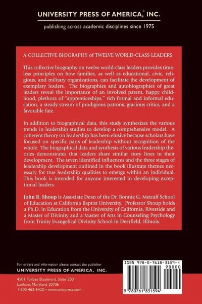 This collective biography on twelve world-class leaders provides timeless principles on how families, as well as educational, civic, religious, and military organizations, can facilitate the development of exemplary leaders. The biographies and autobiographies of great leaders reveal the importance of an involved parent, happy childhood, plethora of 'apprenticeships,' rich formal and informal education, a steady stream of prodigious patrons, gracious critics, and a favorable fate.