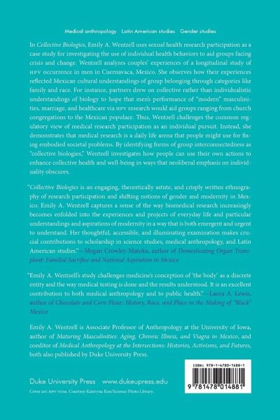 In Collective Biologies, Emily A. Wentzell uses sexual health research participation as a case study for investigating the use of individual health behaviors to aid groups facing crisis and change. Wentzell analyzes couples' experiences of a longitudinal study of HPV occurrence in men in Cuernavaca, Mexico. She observes how their experiences reflected Mexican cultural understandings of group belonging through categories like family and race. For instance, partners drew on collective rather than individualistic understandings of biology to hope that men's performance of "modern" masculinities, marriage, and healthcare via HPV research would aid groups ranging from church congregations to the Mexican populace. Thus, Wentzell challenges the common regulatory view of medical research participation as an individual pursuit. Instead, she demonstrates that medical research is a daily life arena that people might use for fixing embodied societal problems. By identifying forms of group interconnectedness as "collective biologies," Wentzell investigates how people can use their own actions to enhance collective health and well-being in ways that neoliberal emphasis on individuality obscures.