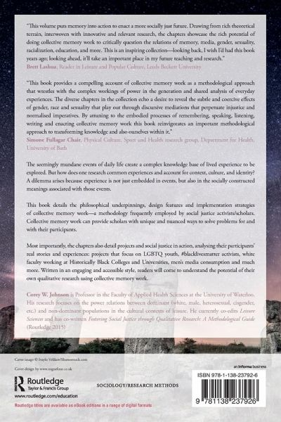 Acknowledgements Part One 1. The History and Methodological Tradition(s) of Collective Memory Work Corey W. Johnson, Dana B. Kivel and Luc S. Cousineau Part Two 2. How Does Media Consumption Contribute to Understandings of Manhood According to Race and Sexual Identity? Rudy Dunlap and Corey W. Johnson 3. How do Adults Remember Their Parents' Reaction to Gender Non-Conformity? Rebecca Eaker, Anneliese Singh and Corey W. Johnson 4. How Can Memories of Enacted Masculinity Create More Effective Elementary School Teachers? Chris Hansen and Corey W. Johnson 5. What are the Experiences of White faculty at Historically Black Colleges and Universities? Needham Yancey Gulley, Anthony F. Patterson and Corey W. Johnson 6. How Do We Sustain Activism?: LGBTQ and Black People Share Their Positive and Negative Experiences Jemelleh Coes, Needham Yancey Gulley and Corey W. Johnson 7. Using Collective Memory Work to Create Safer Schools for Queer and Trans Students: A Story of Love, Liberation, and Transformation Anneliese A. Singh and Corey W. Johnson Part Three 8. Why Shouldn't I Do Collective Memory Work? Potential Challenges and Pitfalls Nikki Laird and Corey W. Johnson 9. Are you next? Common Elements of Collective Memory Work Corey W. Johnson and Harrison Oakes Contributing Authors
