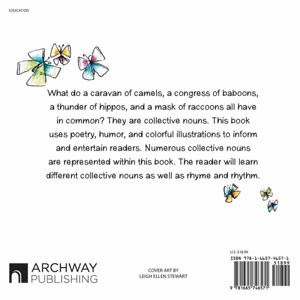 What do a caravan of camels, a congress of baboons, a thunder of hippos, and a mask of raccoons all have in common? They are collective nouns. This book uses poetry, humor, and colorful illustrations to inform and entertain readers. Numerous collective nouns are represented within this book. The reader will learn different collective nouns as well as rhyme and rhythm.