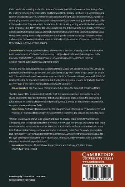 'This is a first rate book, covering basic social choice theory (Arrow, Sen, Condorcet, Borda, etc.), as well as group choice when individuals seek the same objective but disagree on how to bring it about - an area in which Shmuel Nitzan himself has made seminal contributions. The material is well presented. This lucid treatment is ideal for newcomers to the field, but it will also be a valuable resource for graduate students. For every page of text there is half a page of exercises with solutions.' Donald Campbell, College of William and Mary