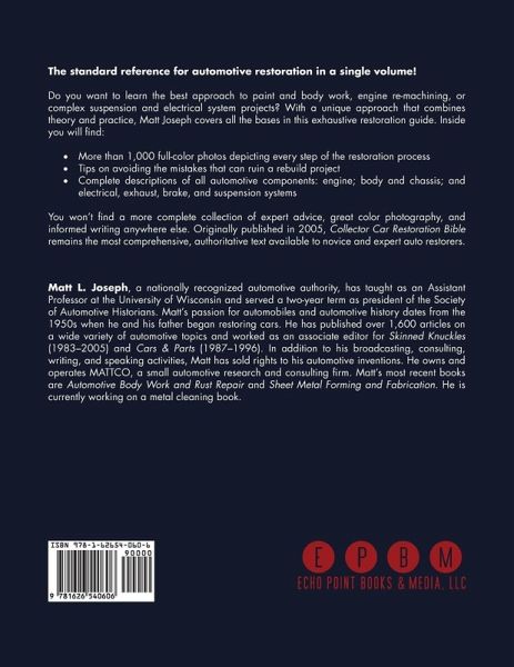 The standard reference for automotive restoration in a single volume! Do you want to learn the best approach to paint and body work, engine re-machining, or complex suspension and electrical system projects? With a unique approach that combines theory and practice, Matt Joseph covers all the bases in this exhaustive restoration guide. Inside you will find: More than 1,000 full-color photos depicting every step of the restoration process Tips on avoiding the mistakes that can ruin a rebuild project Complete descriptions of all automotive components: engine; body and chassis; and electrical, exhaust, brake, and suspension systems You won't find a more complete collection of expert advice, great color photography, and informed writing anywhere else. Originally published in 2005, Collector Car Restoration Bible remains the most comprehensive, authoritative text available to novice and expert auto restorers. Matt L. Joseph, a nationally recognized automotive authority, has taught as an Assistant Professor at the University of Wisconsin and served a two-year term as president of the Society of Automotive Historians. Matt's passion for automobiles and automotive history dates from the 1950s when he and his father began restoring cars. He has published over 1,600 articles on a wide variety of automotive topics and worked as an associate editor for Skinned Knuckles (1983-2005) and Cars & Parts (1987-1996). In addition to his broadcasting, consulting, writing, and speaking activities, Matt has sold rights to his automotive inventions. He owns and operates MATTCO, a small automotive research and consulting firm. Matt's most recent books are Automotive Body Work and Rust Repair and Sheet Metal Forming and Fabrication. He is currently working on a metal cleaning book.
