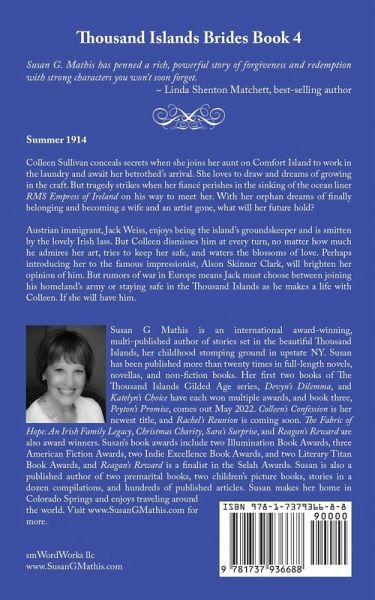 Summer 1914 Colleen Sullivan has secrets as she joins her aunt on Comfort Island to work in the laundry and await the arrival of her betrothed. She loves to draw and dreams of growing in the craft. But tragedy strikes when her fiancé perishes in the sinking of the ocean liner RMS Empress of Ireland on his way to meet her. With her orphan dreams of finally belonging and becoming a wife and an artist gone, what will her future hold? Austrian immigrant, Jack Weiss, enjoys being the island's groundskeeper and is smitten by the lovely Irish lass. But Colleen dismisses him at every turn, no matter how much he fancies her art, tries to keep her safe, and waters the blossoms of love. When Jack introduces her to the famous impressionist, Alson Skinner Clark, Colleen seems to find hope. But rumors of war in Europe prod Jack to choose between joining his family's Austrian army and staying safe in the Thousand Islands to make a life with Colleen. Will she finally embrace his love for her, or will Jack lose the battle and join the war? With the Thousand Islands' summer ending, he hopes she will.