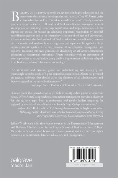 'Critics claim that accreditation often fails to satisfy either pubic or academic needs. Jeffrey Alstete's approach to accreditation management provides a blueprint for closing both gaps.Both administrative and faculty leaders preparing for regional or specialized accreditation can benefit from College Accreditation.' Joseph C. Burke, editor of Achieving Accountability In Higher Education: Balancing Public, Academic and Market Demands and co-author of Fixing the Fragmented University: Decentralization with Direction
