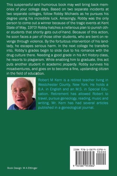 Based on two seperate incidents at two colleges, follow Robby Michaels as he pursues his degree using his incredible luck. Amazingly, Robby was the only person in the whole U.S.A. to come out a winner because of the tragic events at Kent State of May, 1970! Robby hatches a nefarious plan to punish other students that soon gets out-of-hand. Because of this action, he soon faces a pair of those other students, who are bent on revenge through violence. By the fortuitous intervention of his landlady, he escapes serious harm. In the next college he transfers into, Robby's grades begin to slide due to his romance with the college drug culture. Needing a good grade in his Art History class, he resorts to plagiarism. While enabling him to graduate, this act puts another student in jeopardy. Robby survives his adventures, and goes on to become a fine, upstanding citizen in the field of education.