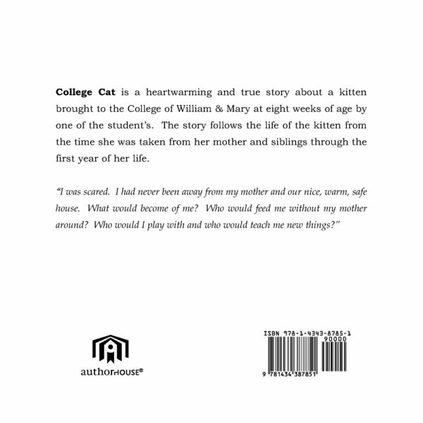 College Cat is a heart warming and true story about a kitten brought to the College of William & Mary at eight weeks of age by one of the student's. The story follows the life of the kitten from the time it was taken from its mother and siblings through the first year of her life. "I was scared. I had never been away from my mother and our nice, warm, safe house. What would become of me? Who would feed me without my mother around? Who would I play with and who would teach me new things?"