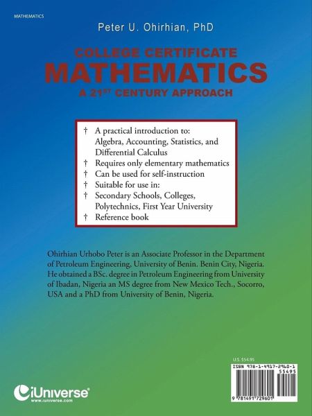 Peter U. Ohirhian COLLEGE CERTIFICATE MATHEMATICS A 21st Century Approach ¿ A practical introduction to: Algebra, Accounting, Statistics, and Differential Calculus ¿ Requires only elementary mathematics ¿ Can be used for self-instruction ¿ Suitable for use in: ¿ Secondary Schools, Colleges, Polytechnics, First Year University ¿ Reference book