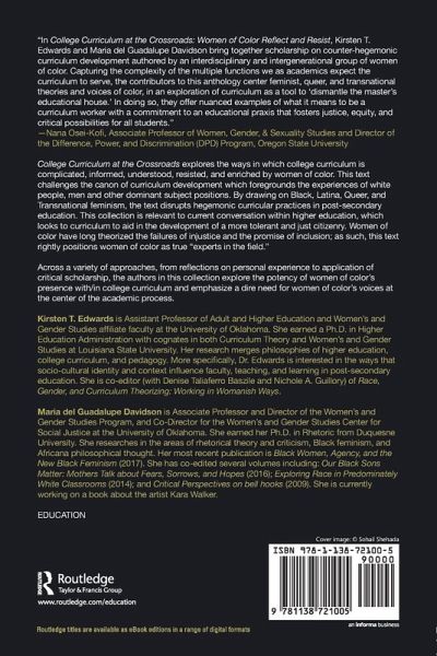 College Curriculum at the Crossroads explores the ways in which college curriculum is complicated, informed, understood, resisted, and enriched by women of color. This text challenges the canon of curriculum development which foregrounds the experiences of white people, men and other dominant subject positions. By drawing on Black, Latina, Queer, and Transnational feminism, the text disrupts hegemonic curricular practices in post-secondary education. This collection is relevant to current conversation within higher education, which looks to curriculum to aid in the development of a more tolerant and just citizenry. Women of color have long theorized the failures of injustice and the promise of inclusion; as such, this text rightly positions women of color as true "experts in the field." Across a variety of approaches, from reflections on personal experience to application of critical scholarship, the authors in this collection explore the potency of women of color's presence with/in college curriculum and emphasize a dire need for women of color's voices at the center of the academic process.
