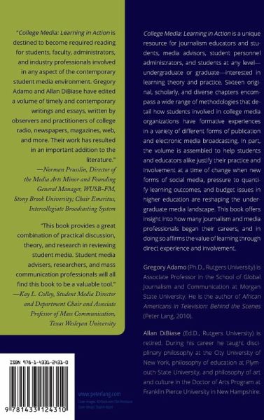 College Media: Learning in Action is a unique resource for journalism educators and students, media advisors, student personnel administrators, and students at any level - undergraduate or graduate - interested in learning theory and practice. Sixteen original, scholarly and diverse chapters encompass a wide range of methodologies that detail how students involved in college media organizations have formative experiences in a variety of different forms of publication and electronic media broadcasting. In part, the volume is assembled to help students and educators alike justify their practice and involvement at a time of change when new forms of social media, pressure to quantify learning outcomes, and budget issues in higher education are reshaping the undergraduate media landscape. This volume offers insight into how many journalism and media professionals began their careers and in doing so affirms the value of learning through direct experience and involvement.