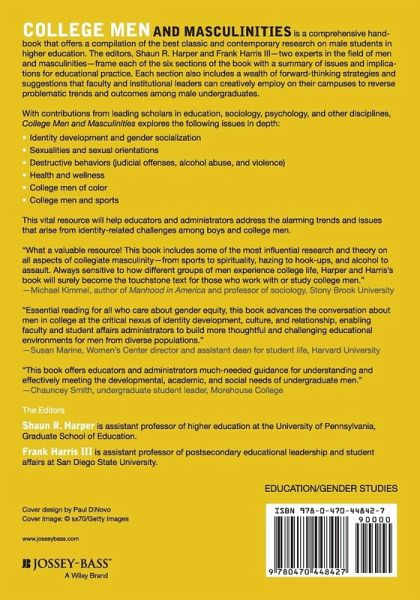 COLLEGE MEN AND MASCULINITIES is a comprehensive handbook that offers a compilation of the best classic and contemporary research on male students in higher education. The editors, Shaun R. Harper and Frank Harris III--two experts in the field of men and masculinities--frame each of the six sections of the book with a summary of issues and implications for educational practice. Each section also includes a wealth of forward-thinking strategies and suggestions that faculty and institutional leaders can creatively employ on their campuses to reverse problematic trends and outcomes among male undergraduates. With contributions from leading scholars in education, sociology, psychology, and other disciplines, College Men and Masculinities explores the following issues in depth: * Identity development and gender socialization * Sexualities and sexual orientations * Destructive behaviors (judicial offenses, alcohol abuse, and violence) * Health and wellness * College men of color * College men and sports This vital resource will help educators and administrators address the alarming trends and issues that arise from identity-related challenges among boys and college men. "What a valuable resource! This book includes some of the most influential research and theory on all aspects of collegiate masculinity--from sports to spirituality, hazing to hook-ups, and alcohol to assault. Always sensitive to how different groups of men experience college life, Harper and Harris's book will surely become the touchstone text for those who work with or study college men." --Michael Kimmel, author of Manhood in America and professor of sociology, Stony Brook University "Essential reading for all who care about gender equity, this book advances the conversation about men in college at the critical nexus of identity development, culture, and relationship, enabling faculty and student affairs administrators to build more thoughtful and challenging educational environments for men from diverse populations." --Susan Marine, Women's Center director and assistant dean for student life, Harvard University This book offers educators and administrators much-needed guidance for understanding and effectively meeting the developmental, academic, and social needs of undergraduate men." --Chauncey Smith, undergraduate student leader, Morehouse College