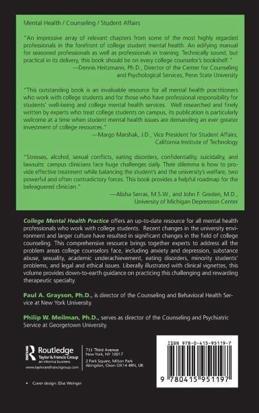 Paul Grayson, a co-editor of the successful 1989 book College Psychotherapy, has teamed up with Phil Meilman, a seasoned veteran of college counseling and psychological services, to compile this needed comprehensive up-to-date treatment guide. After an opening discussion of the campus environment and student mentality, the book provides an overview of the state of college mental health at the start of the 21st century, touching on the issues faced by students of every generation, as well as those concerns unique to this day and age. With an emphasis on practice, and not theory, this easily referenced treatment guide will be of use to anyone working in the mental health fields in and around a college environment.
