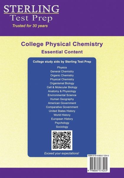 Thousands of students use Sterling Test Prep to achieve academic success!Master essential college physical chemistry topics and improve your grade. This book provides thorough review of topics covered in a typical college physical chemistry course, teaching the foundational theories and concepts necessary to master the core content. The material is clearly presented and systematically organized for learning important principles and relationships, providing comprehensive preparation. From the foundations of physical and chemical properties of matter to complex mechanisms of atomic particles, you will develop a better understanding of chemical phenomena on microscopic and macroscopic levels. This book is an essential overview of chemical kinetics, reaction mechanisms, thermodynamics, and quantum chemistry concepts. Learn about intra and intermolecular interactions, properties of gases, liquids and solids, chemical and phase equilibria, atomic theory and electronic structure. Experienced instructors and researchers analyzed standard college physical chemistry curricula and developed the study material that builds needed knowledge and skills. Our editorial team reviewed and systematized the content for targeted and effective learning, so students can significantly improve their understanding of the subject and succeed in class.