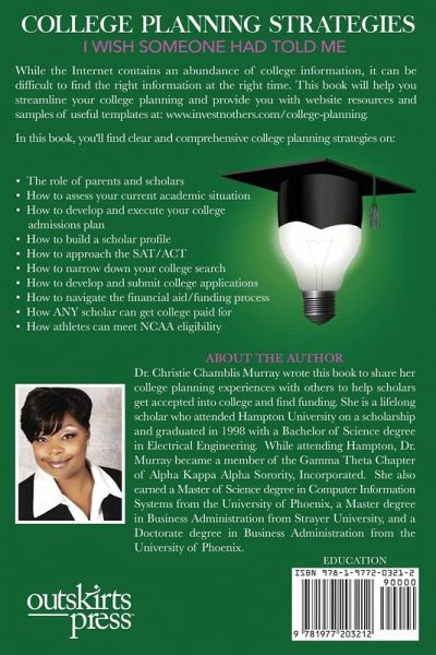 College Planning can be overwhelming and time-consuming! But it does not have to be challenging. College Planning Strategies I Wish Someone Had Told Me is the ultimate guide for middle and high school scholars, athletes, homeschoolers, and families to help with college planning. This book will demystify the secrets of college planning by providing you with college planning strategies to help parents and scholars successfully navigate college admissions and financial funding processes. While the Internet contains an abundance of college information, it can be difficult to find the right information at the right time. This book will help you streamline your college planning and provide you with website resources and samples of useful templates (that can be purchased in a separate Workbook). In this book, you'll find clear and comprehensive college planning strategies on: The role of parents and scholars How to assess your current academic situation How to develop and execute your college admissions plan How to build a scholar profile How to approach the SAT/ACT How to narrow down your college search How to develop and submit college applications How to navigate the financial aid/funding process How ANY scholar can get college paid for How athletes can meet NCAA eligibility Dr. Christie Chamblis Murray, a lifelong scholar, attended Hampton University on a scholarship and graduated in 1998 with a Bachelor of Science degree in Electrical Engineering. She wrote this book to share her personal college planning experiences strategies with others. Someone helped her years ago and she wishes to pay it forward to help others. She believes that knowledge is POWER and she has a strong desire to help close the educational opportunity gap by amplifying awareness about the college planning process. Dr. Murray has helped numerous scholars get accepted into college and find scholarship funding. After meeting scholars and parents in her community who raised questions about college planning and funding she knew there were others out there. She grew motivated to share the practical college planning strategies she wished someone had shared with her…May this book find itself in the hands of scholars who need it the most. This book is your premiere college planning resource.