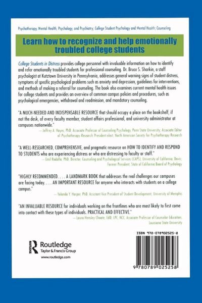 Be prepared to deal with campus situations that involve students in emotional crisis College Students in Distress provides college personnel with invaluable information on how to identify and refer emotionally troubled students for professional counseling. Dr. Bruce S. Sharkin, a staff psychologist at Kutztown University in Pennsylvania, addresses general warning signs of student distress, symptoms of specific psychological problems such as anxiety and depression, guidelines for interventions, and methods of making a referral for counseling. The book also examines current mental health issues for college students and provides an overview of common campus policies and procedures, such as psychological emergencies, withdrawal and readmission, and mandatory counseling. College Students in Distress provides the answers you need to manage difficultand potentially dangeroussituations on campus. Case examples based on real-life experiences give you a clear sense of what can happen when responding to students in emotional distress, particularly when dealing with specific issues and student populations, and will help in your efforts to review and/or revise the current practices of your school. This unique book is essential as a resource and referral guide that raises awareness of this growing national problem without being limited to the characteristics of a particular college or university. Topics examined in College Students in Distress include: the impact of mental health problems on academics the roles and functions of college counseling services indicators of emotional disturbance suicidal behavior self-inflicted harm eating disorders guidelines for intervention accommodations for students with psychological disabilities and much more College Students in Distress is a must-read for faculty and staff members, particularly those working in residential life, student health, and public safety, and for administrative offices within student services and student affairs.