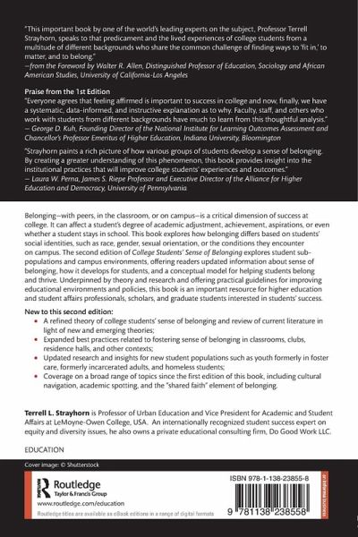 This book explores how belonging differs based on students' social identities, such as race, gender, sexual orientation, or the conditions they encounter on campus. Belonging-with peers, in the classroom, or on campus-is a critical dimension of success at college. It can affect a student's degree of academic adjustment, achievement, aspirations, or even whether a student stays in school. The 2nd Edition of College Students' Sense of Belonging explores student sub-populations and campus environments, offering readers updated information about sense of belonging, how it develops for students, and a conceptual model for helping students belong and thrive. Underpinned by theory and research and offering practical guidelines for improving educational environments and policies, this book is an important resource for higher education and student affairs professionals, scholars, and graduate students interested in students' success.