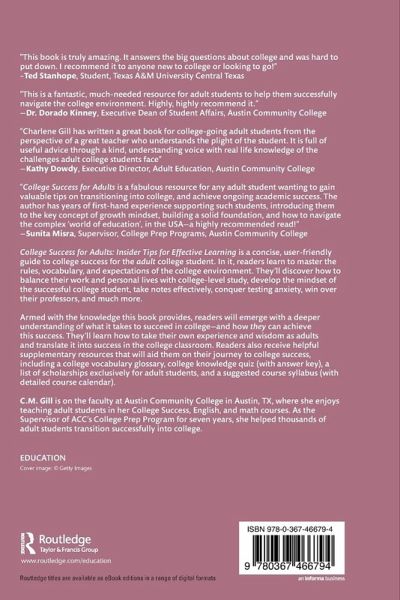 College Success for Adults: Insider Tips for Effective Learning is a concise, user-friendly guide to college success for the adult college student. In it, readers learn to master the rules, vocabulary, and expectations of the college environment. They'll discover how to balance their work and personal lives with college-level study, develop the mindset of the successful college student, take notes effectively, conquer testing anxiety, win over their professors, and much more. Armed with the knowledge this book provides, readers will emerge with a deeper understanding of what it takes to succeed in college-and how they can achieve this success. They'll learn how to take their own experience and wisdom as adults and translate it into success in the college classroom. Readers also receive helpful supplementary resources that will aid them on their journey to college success, including a college vocabulary glossary, college knowledge quiz (with answer key), a list of scholarships exclusively for adult students, and a suggested course syllabus (with detailed course calendar).