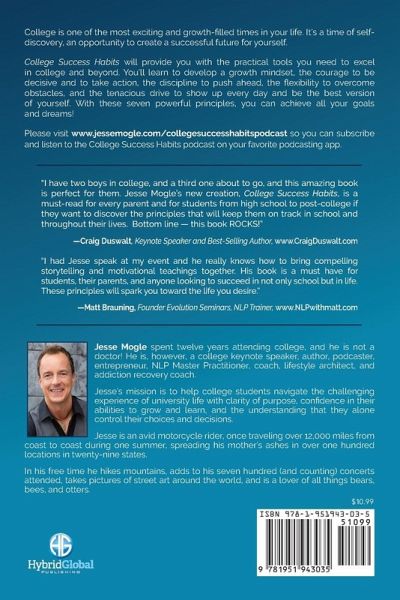 College is one of the most exciting and growth filled times in your life. What you do there, learn there - your overall experience of the college life, both in the classroom and outside of it, will lay the foundation for the course of your life. Your motivation, mindset, and goal achieving will be put to the test daily. Your habits, whether defined as good or bad, will present themselves in every aspect of your life. The habits you've created and followed since you started primary school, way back when, are influencing you today. As you moved through middle and high school these habits became more ingrained. Now you are in college, and these habits are controlling your actions even more - with little to no parental supervi-sion. You know that habits are just a sequence behaviors your mind has memorized, so it can think less about them, and prioritize more energy toward learning and experiencing new things. The main problem is some of these habits you have cultivated throughout your childhood and teen-age years are not healthy - and in many cases, aren't even the behaviors you chose, but rather be-haviors instilled in you by your family, friends, teachers, and anyone else you came into contact with that influenced you - on purposefully or inadvertently. We both know that new habits can be formed and old habits dropped. Imagine if there were a set of principles you could adopt that gave you the keys to success in college and throughout your life. This book will provide you with the steps you can take to rewire your mind and beat the over-whelm you feel in the many aspects of your day-to-day life. College Success Habits will draw your habits into your awareness. Here you will have the oppor-tunity to decide if you want to keep, alter, or eliminate that habit altogether. There will be effort on your part. Anyone who tells you change can be effortless is a charlatan because while deciding to change takes a second - the follow through is where the effort lies. You can accomplish anything you want in life. Everything this amazing world has to offer is at your fingertips. You just decide what it is you truly desire in your life and then you begin to work your tail off until it comes to fruition. That's the part of the "you can have and be anything you want" cliché that is so often left out. You have to put in the work, you have to do little tasks every day toward your "projects" in order to achieve your goals and see the vision of your life actualized. College Success Habits is your guide, your road map, and it's up to you to stick with it and follow through in order to achieve your "meant to be" in your life.