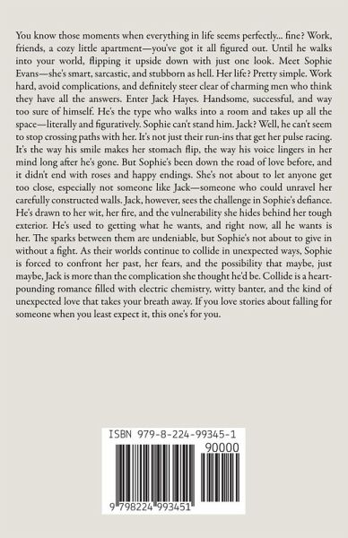 You know those moments when everything in life seems perfectly... fine? Work, friends, a cozy little apartment-you've got it all figured out. Until he walks into your world, flipping it upside down with just one look. Meet Sophie Evans-she's smart, sarcastic, and stubborn as hell. Her life? Pretty simple. Work hard, avoid complications, and definitely steer clear of charming men who think they have all the answers. Enter Jack Hayes. Handsome, successful, and way too sure of himself. He's the type who walks into a room and takes up all the space-literally and figuratively. Sophie can't stand him. Jack? Well, he can't seem to stop crossing paths with her. It's not just their run-ins that get her pulse racing. It's the way his smile makes her stomach flip, the way his voice lingers in her mind long after he's gone. But Sophie's been down the road of love before, and it didn't end with roses and happy endings. She's not about to let anyone get too close, especially not someone like Jack-someone who could unravel her carefully constructed walls. Jack, however, sees the challenge in Sophie's defiance. He's drawn to her wit, her fire, and the vulnerability she hides behind her tough exterior. He's used to getting what he wants, and right now, all he wants is her. The sparks between them are undeniable, but Sophie's not about to give in without a fight. As their worlds continue to collide in unexpected ways, Sophie is forced to confront her past, her fears, and the possibility that maybe, just maybe, Jack is more than the complication she thought he'd be. Collide is a heart-pounding romance filled with electric chemistry, witty banter, and the kind of unexpected love that takes your breath away. If you love stories about falling for someone when you least expect it, this one's for you.
